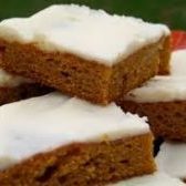 Moist Pumpkin Bars with our cream cheese frosting. You can purchase these as singles or a 1/4 sheet pan of them is cut in 16 servings